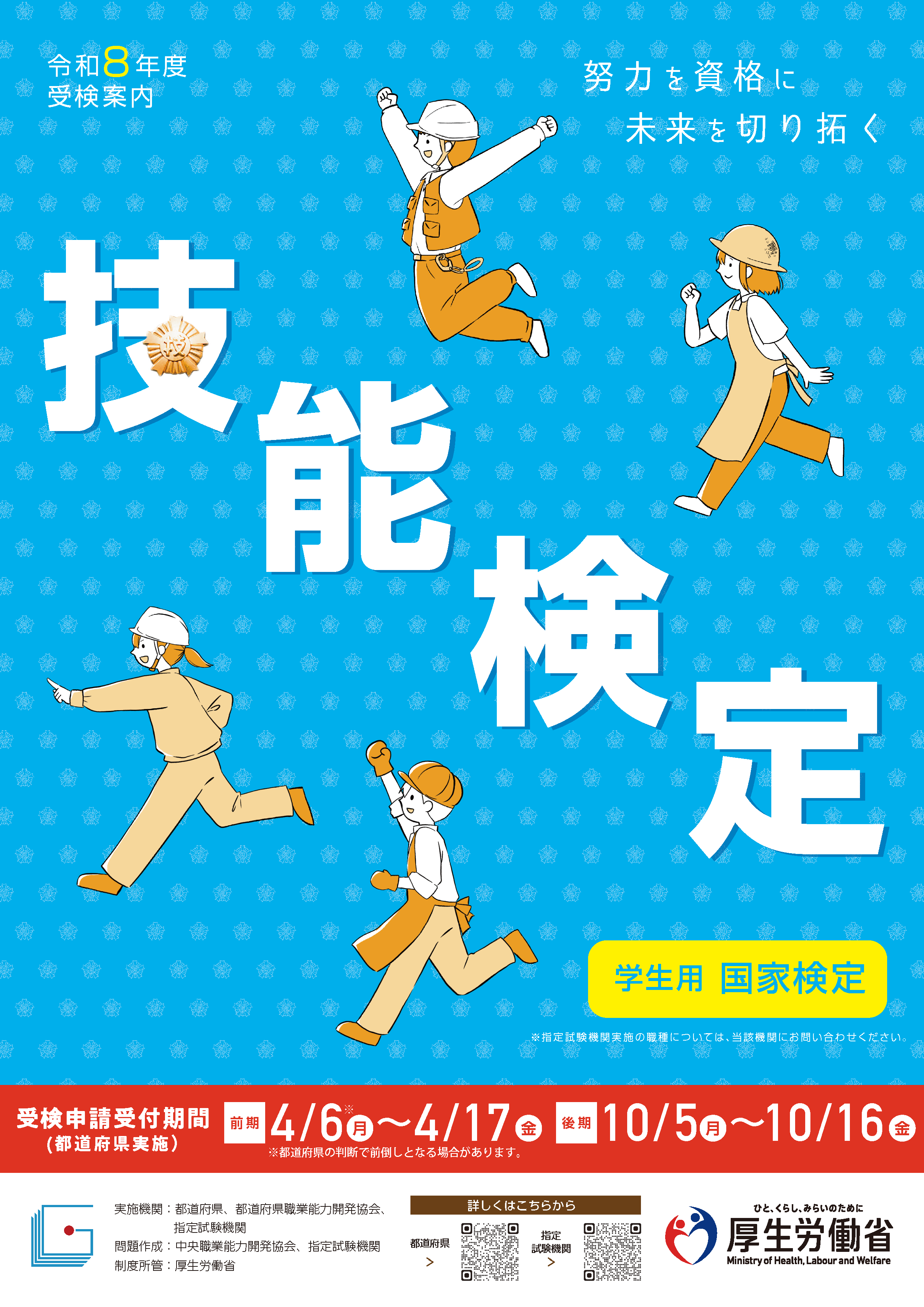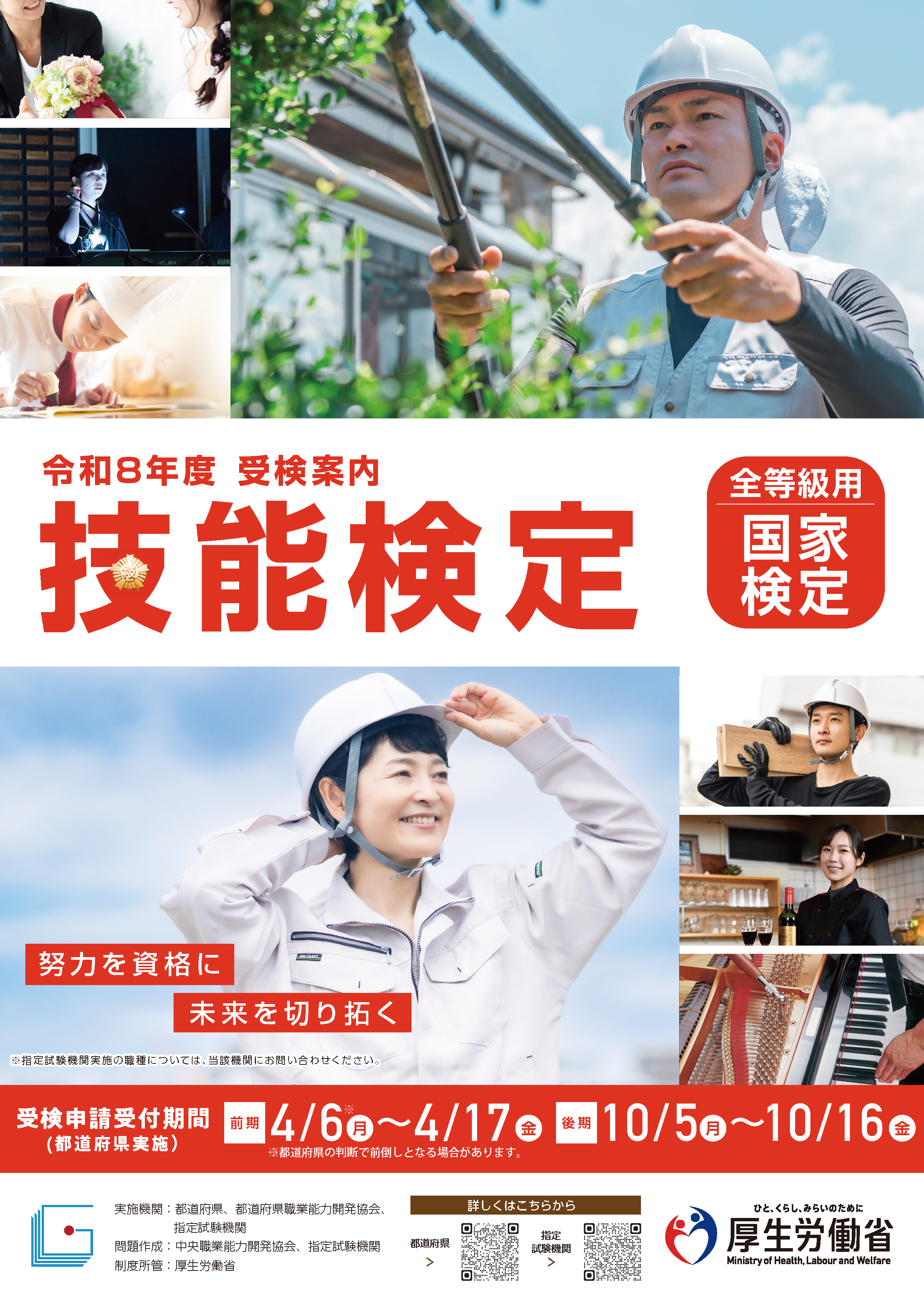 試験日程・内容について HOME 試験日程・内容について 技能検定受検概要 技能検定制度とは 技能検定制度について[厚生労働省] 技能検定のご案内 [中央職業能力開発協会] ※都道府県方式のもの 技能検定の受検に必要な実務経験年数一覧 [厚生労働省] 技能検定案内(パンフレット) 令和8年度技能検定受検案内(全等級用)(3.2MB) 令和8年度技能検定受検案内(学生用)(3.42MB) 実施日程 今年度の試験実施日程をご確認頂けます。 実施日程 実施職種・試験概要 今年度の実施職種・試験概要をご確認頂けます。 実施職種・試験概要 過去受検者・合格者の統計データ 過去受検者及び合格者の統計データをご確認頂けます。 過去受検者・合格者の統計データ PAGE TOP PDF形式のファイルをご覧いただくためには、Adobe Reader(無償)が必要です。 Adobe Reader ダウンロードページ 試験日程・内容について 実施日程 実施職種・試験概要 過去受検者・合格者の統計データ Tweet